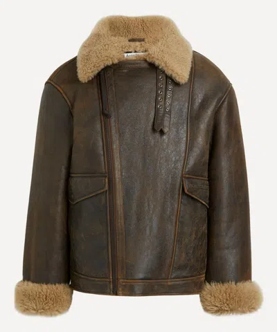 Acne Studios applies its androgynous, cool-kid approach to an everyday outerwear essential with the shearling jacket. This aviator jacket is crafted from sumptuous lamb shearling and suede leather complete with sanded seams for a true vintage finish. Designed for a relaxed, boxy fit with a double-strap and buckle collar, it's secured with a front zipper closure.