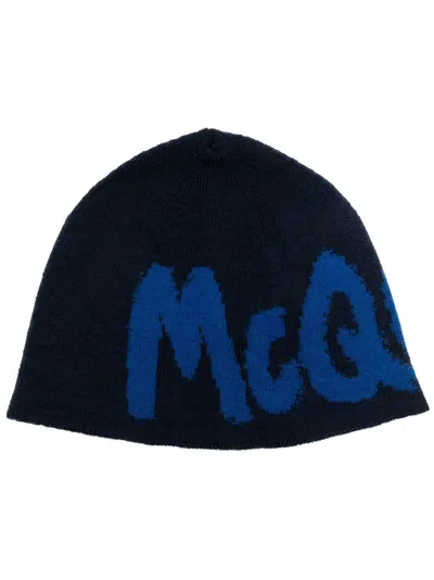 Hat with logo by ALEXANDER MCQUEEN in blue, in wool, featuring a blue logo on the front.