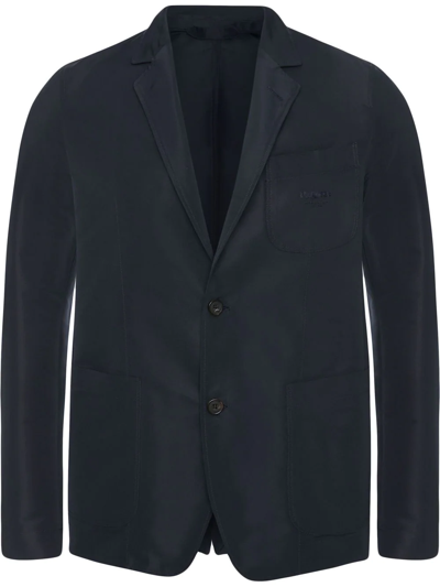 Deconstructed logo-embroidered jacket from Alexander McQueen featuring navy blue, deconstructed design, embroidered logo at the chest, notched lapels, front button fastening, long sleeves, buttoned cuffs, central rear vent, chest patch pocket and two front patch pockets.