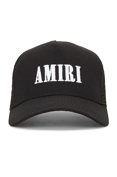 Amiri Logo Trucker in Black & White - Black & White. Size all. Self: 100% cottonLining: 100% lyocellMesh: 100% polyester. Made in USA. Adjustable back strap. Front embroidered AMIRI logo. Mesh back. Brim measures approx 2.75 in length. AMIF-MA92. AW22MAH008-004. About the designer: Mike Amiri's eponymous label fuses rock and roll with haute couture. Deriving its inspiration from Amiri's upbringing in Hollywood, the California-contemporary brand is handmade in LA and worn by A-listers who appreciate its one-of-a-kind nature: think hand-painted leather, Swarovski crystal-embellished denim, and cashmere distressed with bullet holes. Amiri began his career crafting stage pieces for iconic musicians like Axl Rose and Steven Tyler, and to this day his house continues to evoke the glam and exuberance of the golden era of rock. Amiri is for forward-thinkers who crave remarkable pieces that blend LA swagger with exceptional savoir-faire.