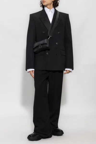 Black double-breasted blazer from Balenciaga. Crafted from faux silk,this long sleeve design features two flap pockets and one slip pocket.