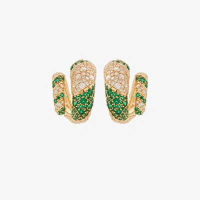 These gold-plated Bottega Veneta Spiral hoop earrings are made in Italy from sterling silver and are suitable for pierced ears. Embellished with swirling patterns of pavé green cubic zirconia stones and white crystals, they secure with butterfly fastenings. With a silhouette reminiscent of a ram's horn, these Bottega Veneta earrings serve as a reminder to always grab life by the horns.