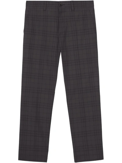 Grey cotton check-pattern tailored trousers from BURBERRY featuring check pattern, front button and zip fastening, belt loops, two side slit pockets, two rear welt pockets and pressed crease.