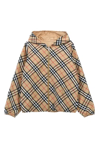 KIDS Burberry Check and solid cotton blend reversible jacket, Equestrian Knight Design embroidery on both sides, hood, front zip closure, pockets, long sleeves with elastic cuffs, elastic hem. Composition: 56% polyester, 44% cottonSize&Fit: true to size fit