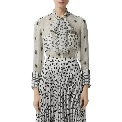 From Riccardo Tisci's Burberry debut collection, titled 'Kingdom,' this bowed silk blouse is boldly spotted in a nod to the season's animalistic theme. Monochromatic check-print cuffs provide graphic contrast. 25" front length; 23" back length; 32" tie length (size 2) Front snap closure Tie neck Long sleeves with snap cuffs Chest patch pockets 100% silk Dry clean Made in Italy Collectors