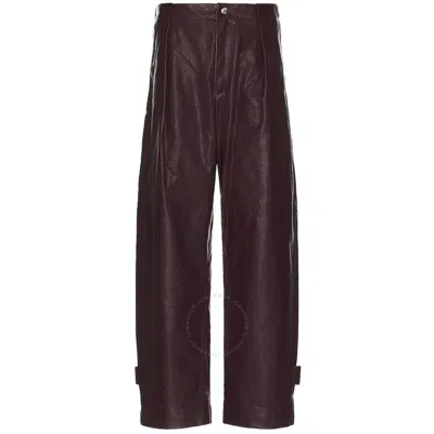 Burberry Mens Bottoms. Fashion category: Pants & Leggings. SKU: 8079086. Material: Calfskin;Cotton. Color: Plum. Burberry Leather Wide-Leg Pleat-Detail Pants. Calf leather pants with a cotton lining, pleat detailing, front press-stud and zip fastening, adjustable waist strap, two side inset pockets, rear welt pocket, press-stud fastening cuffs, wide legs, and a straight hem. Outer: Calf Leather 100%; Lining: Cotton 100%. Made in Italy.