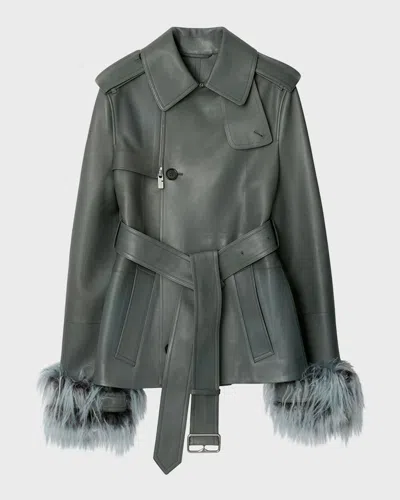 Burberry Mongolian Lamb Shearling And Leather Short Trench Coat In Cobble