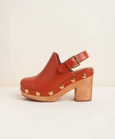 A classic platform clog with hardware detailing. All leather uppers, 4" heel and 2" platform, round brass studs, adjustable slingback strap and memory foam insoles. Luxe and surprisingly versatile.