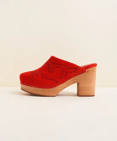 A classic Western inspired update to our iconic Marlo clog. Embroidered leather or suede uppers, 2" platform and 4" heel. A quintessential clog style with a new look.