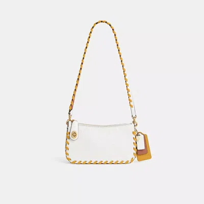Pre-owned and now (re)loved this Penn Shoulder Bag is a very special Coach upcrafted design inspired by our commitment to rethinking and reducing our impact on the planet. Saved from the landfill this gently-worn bag was lovingly repaired and transformed by our in-house craftspeople who added clever details to give it a second life. It's completely one-of-a-kind and comes with its own unique set of charms. Wear it love it pass it on. Reimagined with bright yellow color pops by Rose Oliva featuring sleek hand-laced whipstitching for rich depth and artisanal dimension this compact style has been expertly cleaned conditioned and restored. Our talented craftspeople Nicole Izquierdo and Yngrid Pichardo Baez hand-decorated the front and strap with sunny yellow whipstitching replaced the zipper carriage then added a playful repurposed charm. Inspired by archival Coach Y2K designs but perfected for today our swingy slim Penn bag is effortlessly minimalist. Finished with our iconic turnlock closure on the zipper pull the glossy Signature patent leather style can be worn on the shoulder or carried as a clutch. Coach Upcrafted Penn Shoulder Bag In Signature Leather - Women's Purses - Brass/chalk