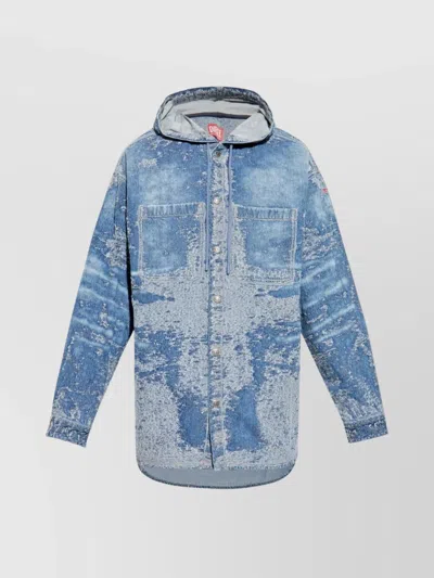 Hooded design | Longline silhouette | indigo blue | Distressed effect | slouchy drawstring hood | two chest patch pockets | front press-stud fastening | press-stud fastening cuffs