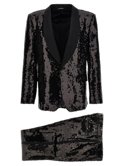 Sicilia dress in sequins made of tuxedo jacket with shawl lapels in silk duchesse, and tailor-cut pants with flat front. Drop 7R. Colours. : Black. Dimension. : true to size fit. MPN. : GKOSMTFLSEPN0000. .