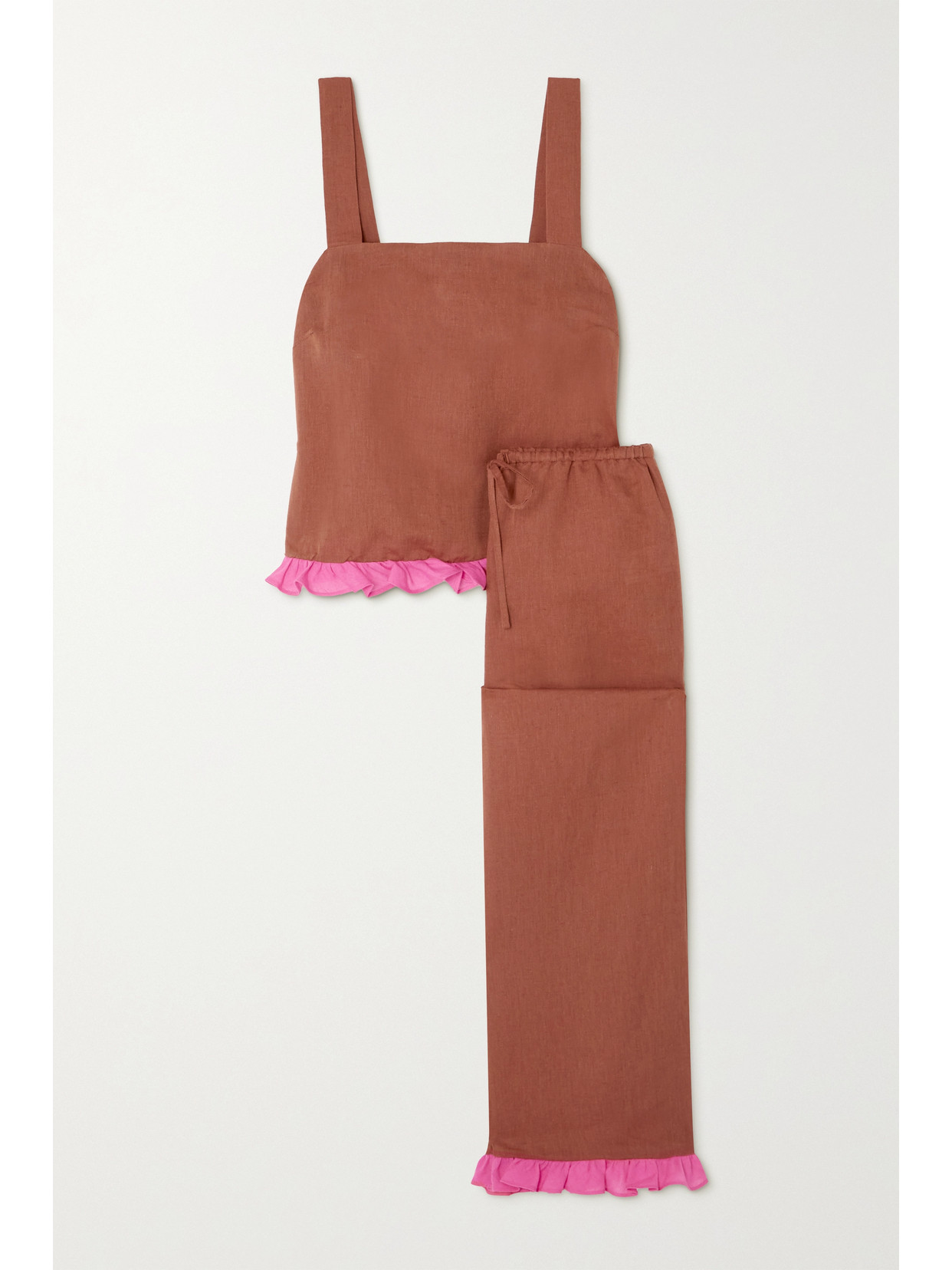 Dora Larsen Alexa Ruffled Linen And Organic Cotton-blend Pajama Set In Brick