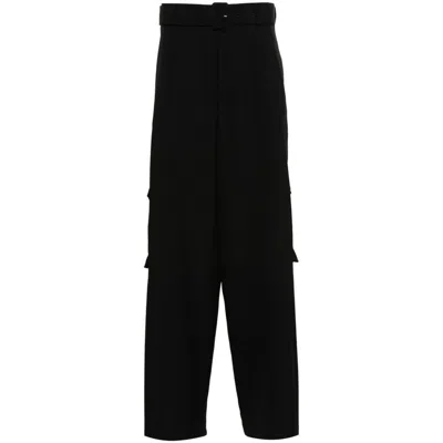Black wool grain de poudre belted waist belt loops two side slit pockets pleat detailing two side cargo pockets wide leg two rear welt pockets concealed front button, hook and zip fastening