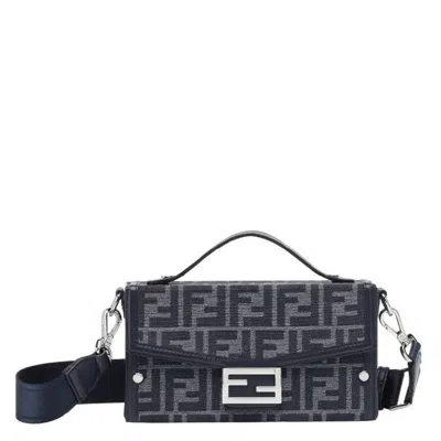 Fendi Mens Crossbody. SKU: 7VA565-AG0M-F1O97. Color: Denim Blu/Blu Scr/P. Size: H 13 x D 6.5 x W 21.5 cm. Fendi FF Jacquard Soft Trunk Baguette Bag. The Baguette Soft Trunk bag is crafted from blue-colored jeans-style FF jacquard panels and features a flap secured with a magnetic FF clasp. It is embellished with dark blue leather and boasts a lined interior with a leather pocket that includes six cardholder slots. The bag is finished with palladium-tone metalware, adding a touch of elegance. It also comes with a tech fabric cross-body shoulder strap, adjustable and detachable, adorned with FENDI lettering. 62% Polyester, 33% Cotton, 5% Resin, 100% Calf Leather. Made in Italy.