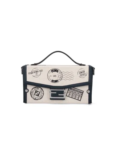 Fendi "Baguette Soft Trunk" white cotton bag with blue calf leather trim, contrast "Postcards" logo print pattern, handle, adjustable and removable shoulder strap, magnetic flap closure, "FF logo buckle detail." in silver metal, six internal card slots, an internal flat pocket, a single internal compartment. Size Type: STANDARDSKU: 7VA565AUGWF1SCV Our Products Are 100% Genuine. In All Cases We Stand By The Authenticity Of Every Product Sold On Our Site.