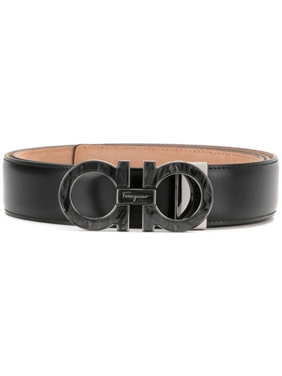 Gancini belt in black calfskin from Salvatore Ferragamo, model with adjustable fit, silver-tone buckle closure, embossed logo and square tip. This item is in size 95 and the color is