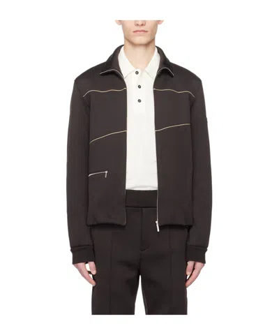 Funnel collar, two-way zipper front, zipper pocket, elastic hem, sleeve logo decoration, ribbed cuffs, logo carved hardware design.