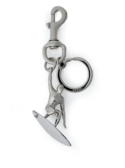 silver-tone surfer charm snap-hook attachment split ring engraved logo metal construction