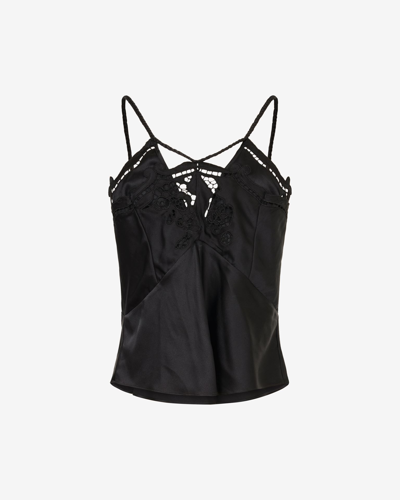 Joys sleeveless top from ISABEL MARANT featuring black, silk blend, crochet panelling, spaghetti straps, U-neck, open back and curved hem.