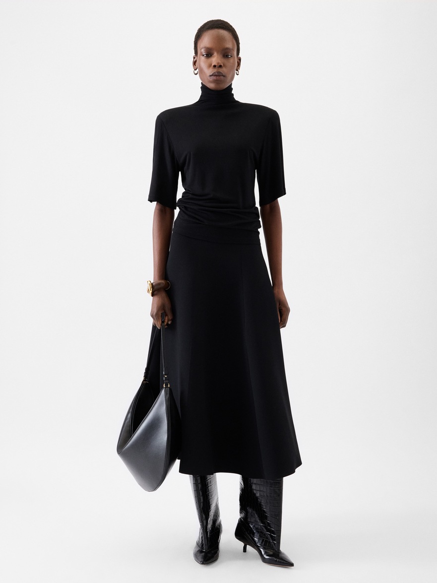 Draped turtleneck t-shirt . Straight fit. Fluid viscose jersey. Integrated turtleneck. Rounded shoulder pads . Draped elbow-length sleeves. Embroidered "J" on the front. Invisible zipper on the back The model is 180cm and wears a size XS
