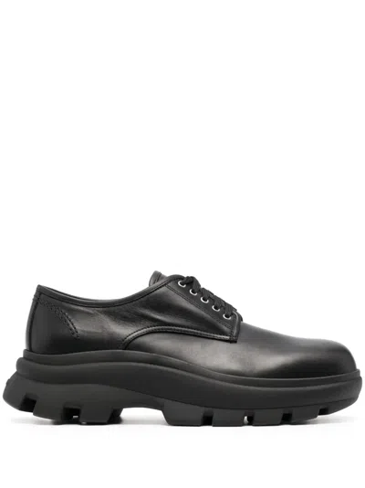 chunky sole derby shoes from JIL SANDER featuring black, calf leather, round toe, front lace-up fastening, branded insole and chunky rubber sole.