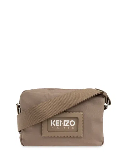beige top zip fastening adjustable shoulder strap internal slip pocket logo appliqué