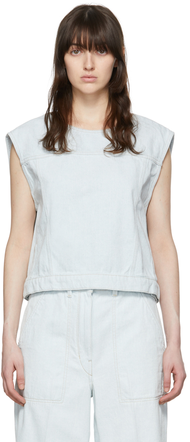 Paneled non-stretch denim blouse. · Scoop neck · Vents and adjustable button tabs at hem · Contrast stitching in beige Supplier color: Sky
