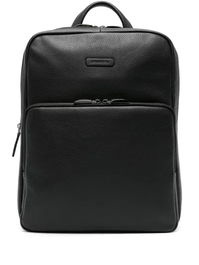 black calf leather grained texture logo patch to the front two-way zip fastening single rolled top handle two padded adjustable shoulder straps front zip-fastening pocket main compartment internal logo plaque multiple internal slip pockets internal laptop pocket internal zip-fastening pocket logo-jacquard lining