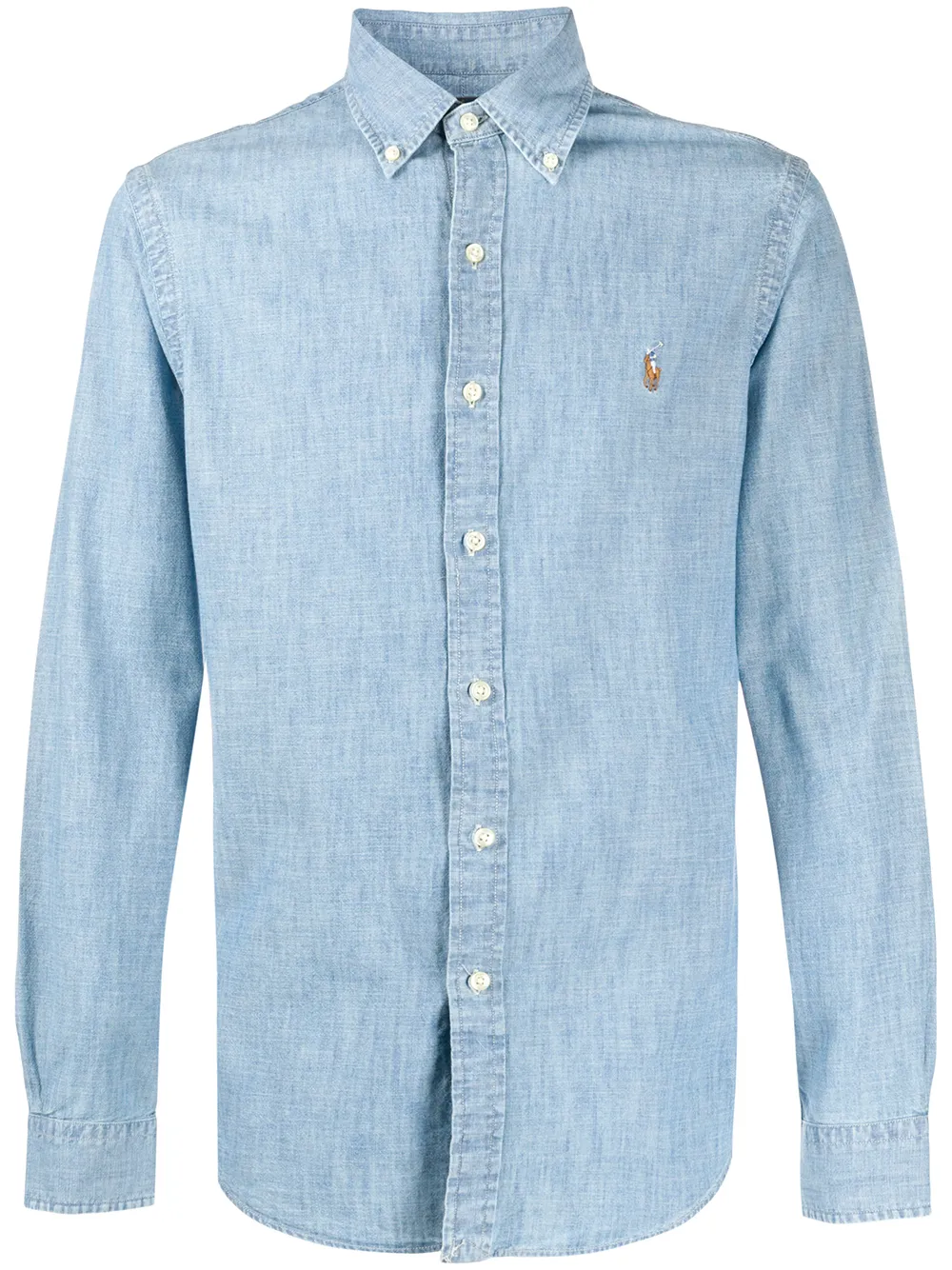 Blue cotton logo embroidered shirt from Ralph Lauren featuring a button down collar, a front button fastening, a contrast embroidered logo at the chest, long sleeves, button cuffs and a curved hemline.
