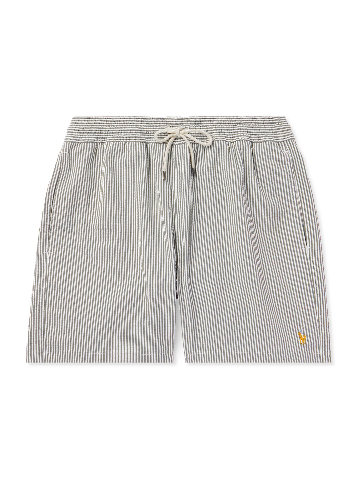Polo Ralph Lauren Traveler Straight-leg Mid-length Striped Cotton-blend Seersucker Swim Shorts In Gray