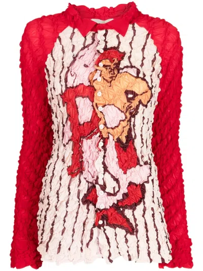 bright red illustration-style print ruched detailing smocked panel classic collar front button fastening shirt sleeves straight hem