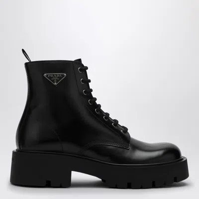 Black brushed leather ankle boot from Prada featuring a lace-up fastening, a round toe, an enamelled metal logo triangle on the side and a rubber sole.