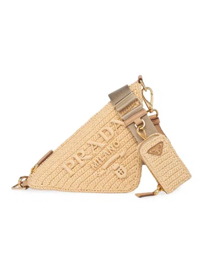 A study on the triangle inspires new geometric shapes and original interpretations of Prada's historic code that was first introduced on trunks designed by Mario Prada. An expression of uniqueness and modernity, its iconic line inspires the shape of this raffia shoulder bag that is accented with a modular shoulder strap for versatile wear. The logo also appears as a precious embroidered detail on the front. Raffia-effect yarn Crochet workmanship Detachable, adjustable 85 cm / 33.4'' logo-print woven tape shoulder strap Removable zipper pouch Metal hardware Embroidered logo on the front and enameled metal triangle logo on the side Zipper closure Logo-print nylon lining Made in Italy SIZE: 26.0 W / 10.2'' W x 14.0 H / 5.5'' H x 10.5 L / 4.1'' L. Lsd Handbags - Prada Handbags Access > Prada > Saks Fifth Avenue > Barneys. Prada. Color: Beige Khaki.