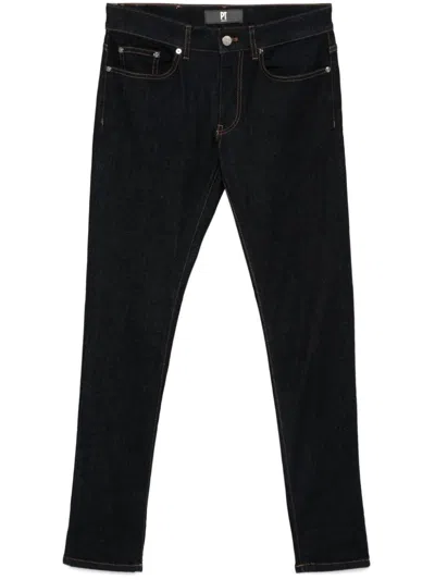indigo blue cotton blend denim logo patch to the rear front button and zip fastening belt loops classic five pockets skinny cut