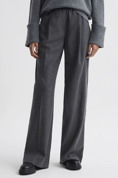 Choose the grey Valeria trousers for a workwear look that catches compliments. They're crafted from a smooth wool blend with a flannel finish and fitted with an elasticated, branded waistband for a comfortable wear. Pleats are featured to the front, subtly refining the look. Pair with knitwear and chunky loafers for a modern office edit. Wool blend Flannel finish Elasticated, branded waistband Pleats to front Side-slip pockets Wide leg