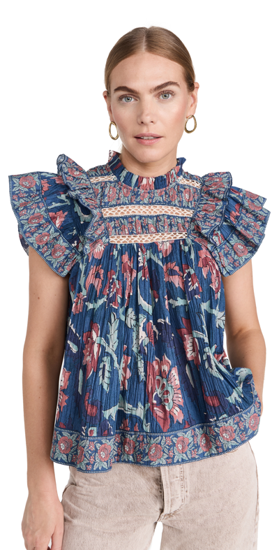 Fabric: Lightweight, non-stretch weave. Floral pattern. Smocked yoke and lace trim. Flutter sleeves and ruffle trim. Button keyhole at back. Shell: 100% cotton. Wash cold. Imported, India. Measurements: Measurements from size S Length: 23.25in / 59.0cm, from shoulder