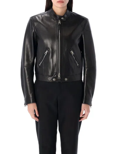 Leather Racer Jacket By Tom Ford. Featuring: Fluid Plongé Leather Biker Collar With Press Stud Fastening Front Zip Closure Leather Zip Puller With Embossed Logo Front Slanted Zipper Pockets Zipped Cuffs Cropped Fully Lined Model Is 1,70 M And Wears Size 40 Composition: 100% lamb leather Lining, 100% viscose