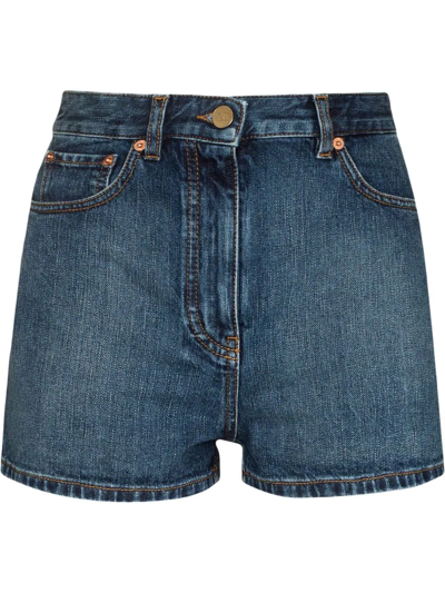 VGOLD denim shorts from VALENTINO featuring indigo blue, cotton, VGold detail, logo patch to the rear, high waist, classic five pockets and front button fastening.