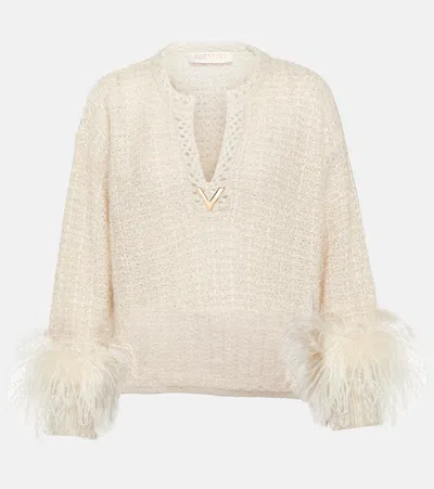 Valentino Vgold Feather-trimmed Lamé Sweater In Weiss