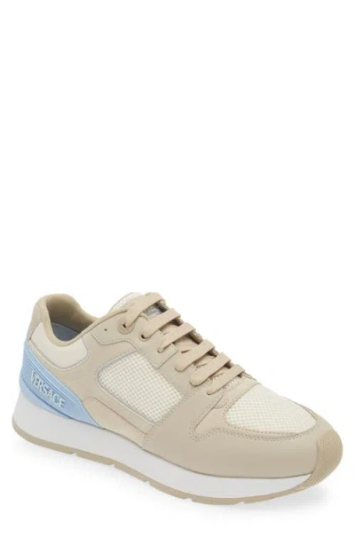 Versace Mixed Media Sneaker In Mastic Chiffon Blu
