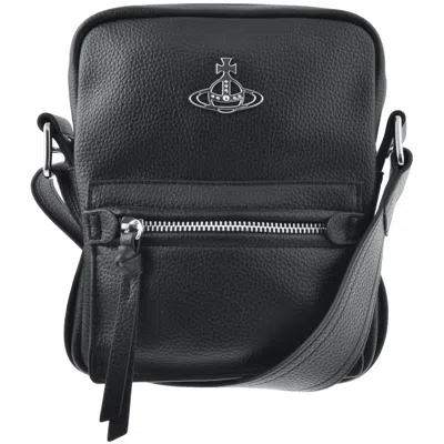 Vivienne Westwood Jackson Crossbody Satchel Bag In Black. An all over textured faux leather design with an adjustable crossbody strap. A zip fastening to the main compartment. The signature Vivienne Westwood Orb metal logo is situated on the front of the bag in silver with an additional zip entry pocket situated below. This bag measures approximately 24cm in height 19cm in width and 10cm in depth and comes with a branded cloth dust bag. 100% Polyurethane.