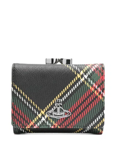 black Saffiano leather plaid pattern clasp closure multiple card slots signature Orb plaque detail