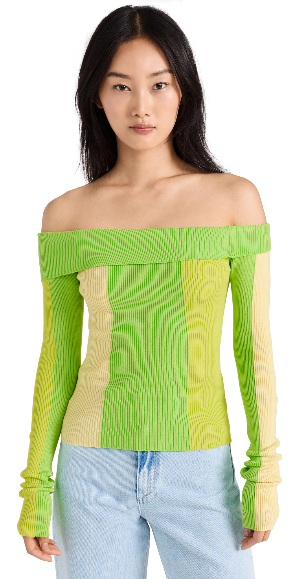 Fabric: Mid-weight, ribbed kit. Striped pattern. Off-shoulder neckline. Long sleeves. Shell: 82% cotton/17% nylon/1% lycra spandex. Hand wash. Made in Belgium. Measurements: Measurements from size XS Length: 15.25in / 39.0cm, from center back